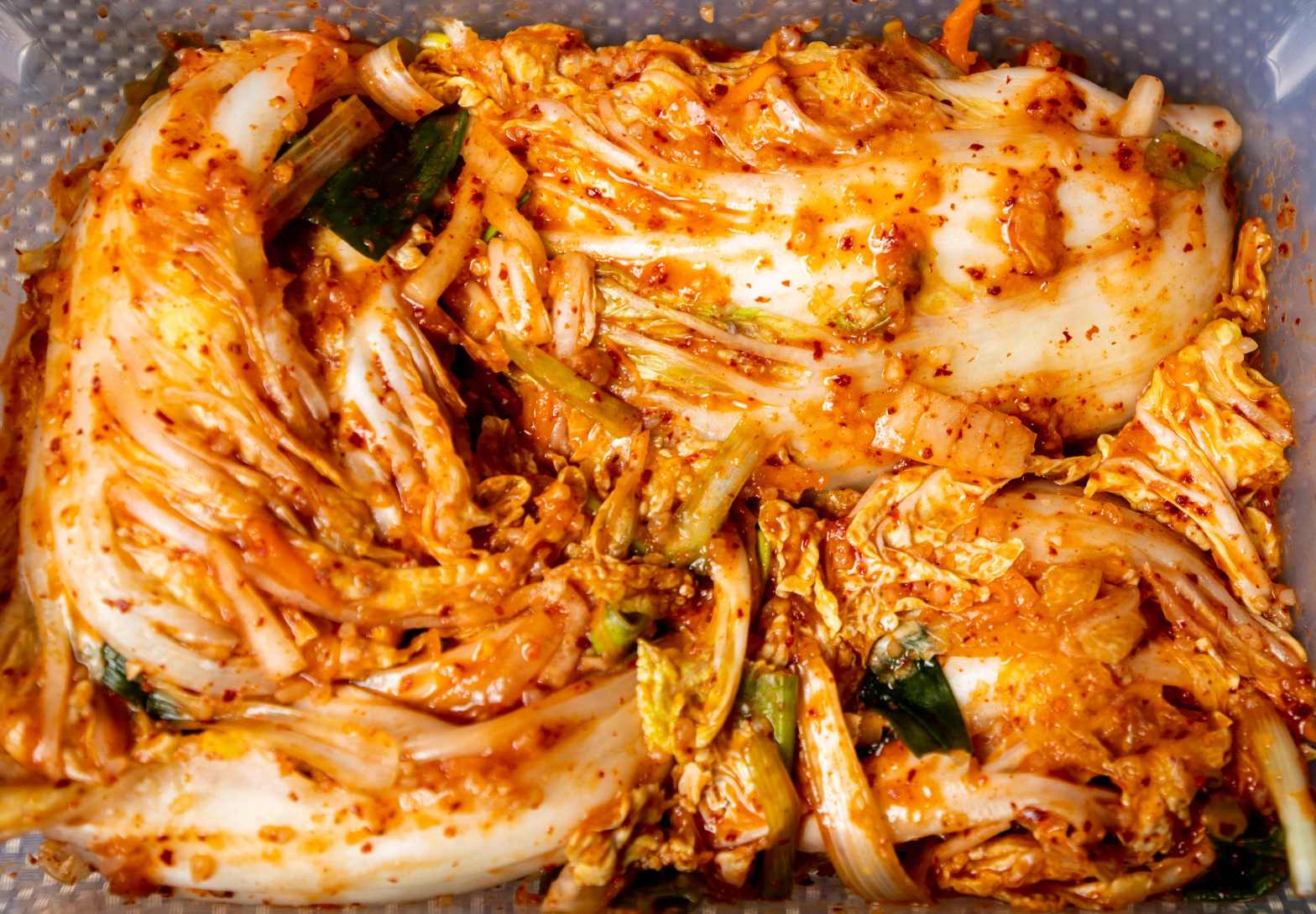 - Während der Fermentation, kleine Blasen werden langsam bilden. Jeder 1 oder 2 Tage die Kimchi Dose aufmachen und das Kimchi mit einem sauberen Löffel heruntergedrückt, damit die Luftblasen rauskommen. Das Kimchi kann sehr lang im Kühlschrank gelagert werden, wenn Kimchi immer unten dem Kimchisaft bleibt.