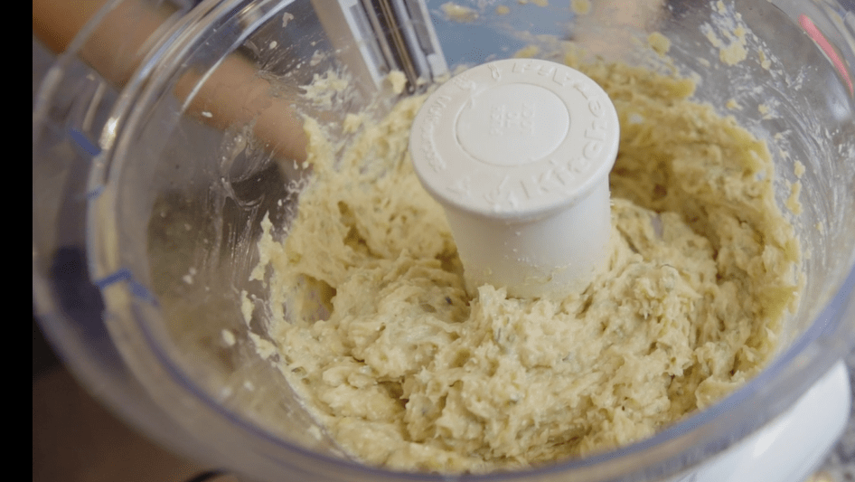 - Hähnchenbrust mit Salz in der Küchenmaschine reintun und zerkleinern lassen. Das Fleisch soll sehr klebrig sein.
