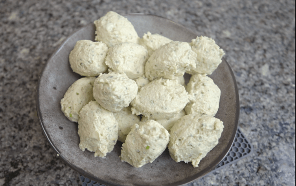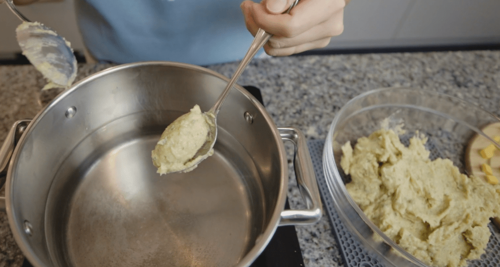 - Die Fleischmaße mit zwei Löffeln formen, bis Klöße Form zu sehen ist. Die Klöße im Wasse ca. 5-7 Minuten lang mit 70 Grad Wassertemperatur garen lassen. Fertig.